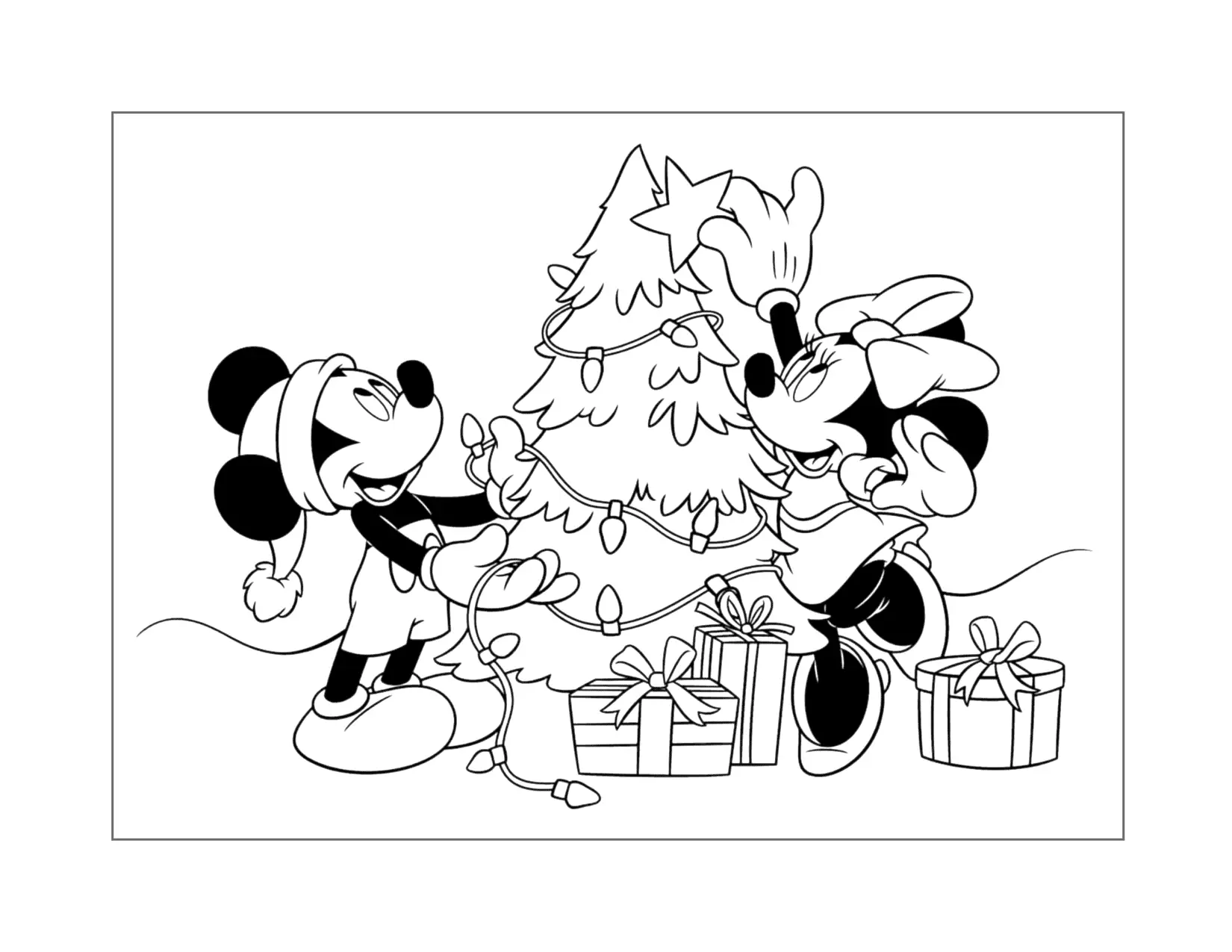 Mickey e Minnie decoram a página para colorir da árvore de Natal