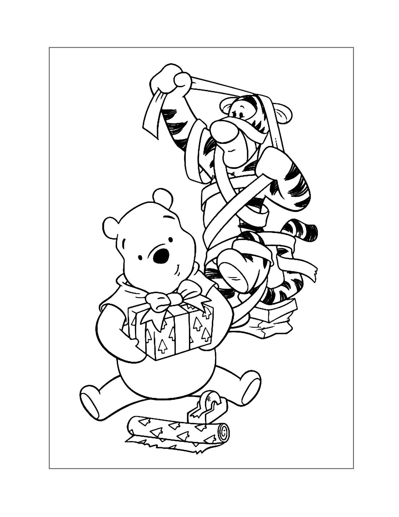 Pooh e Tigger embrulhando presentes de Natal para colorir