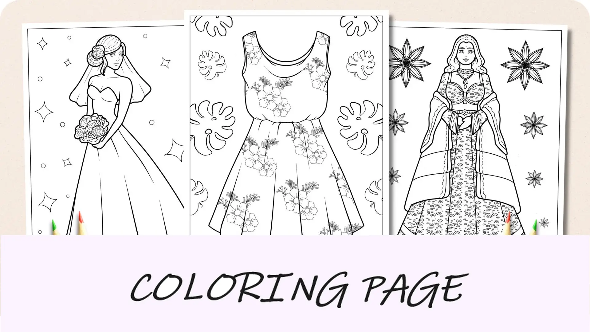 Escolha uma página para colorir de vestido com um vestido moderno ou curto para fazer este lindo pôster.