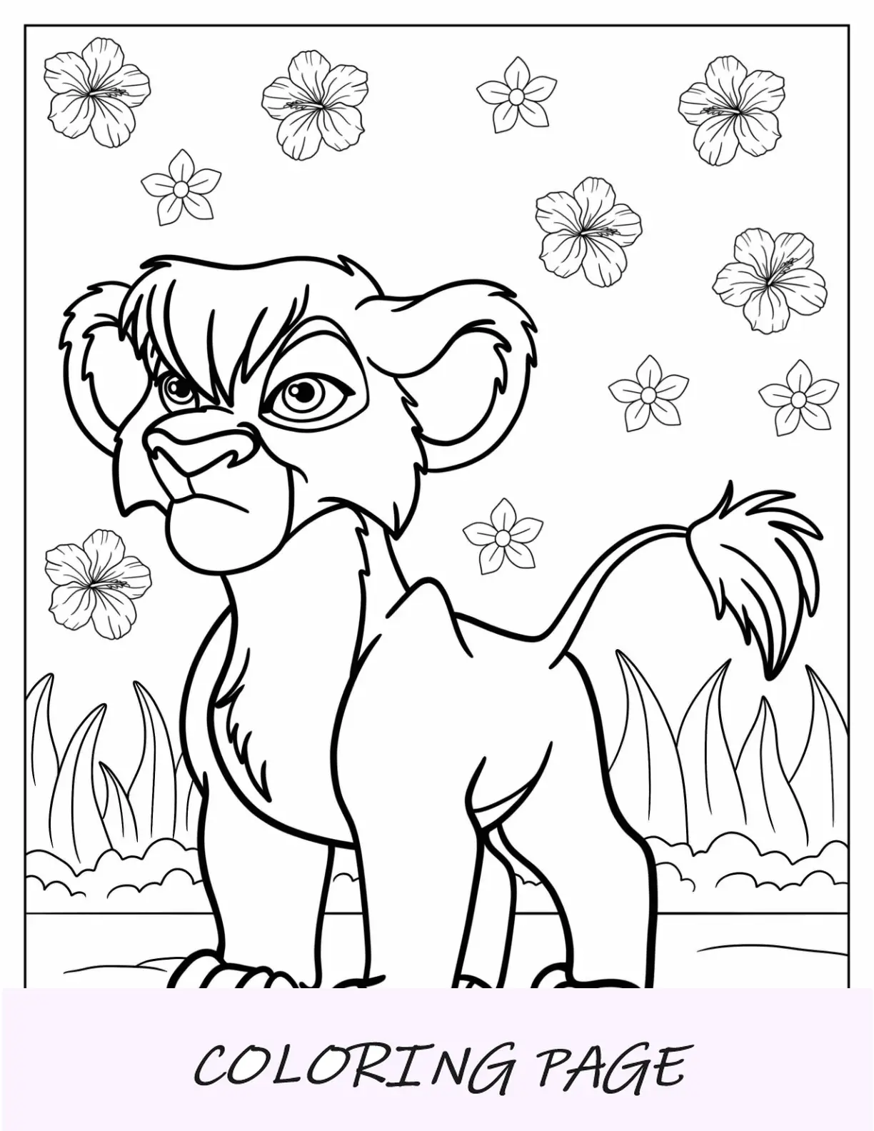 Página para colorir do guarda leão Kion, Ono, Fuli e flores para crianças