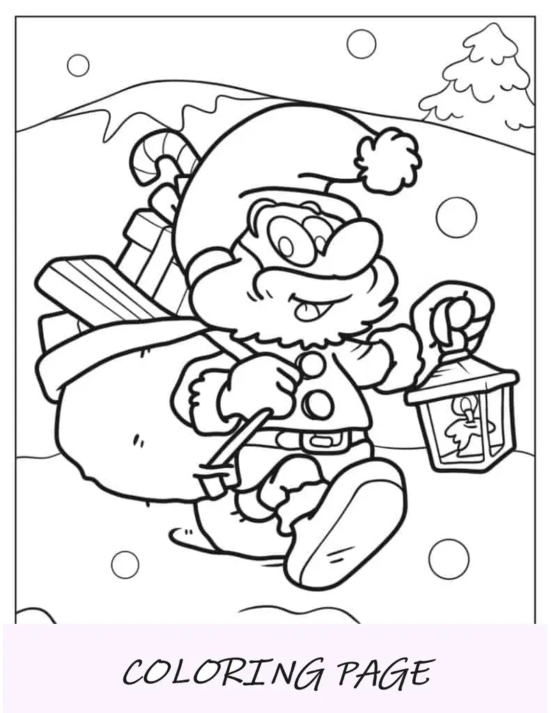 Papai Noel Smurf ao lado da árvore de Natal para colorir